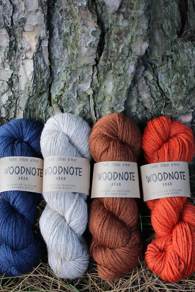 Woodnote Aran is a blend of 3 wools: Bluefaced Leicester, Masham, and Merino. 100% of this wool comes from non-mulesed sheep.